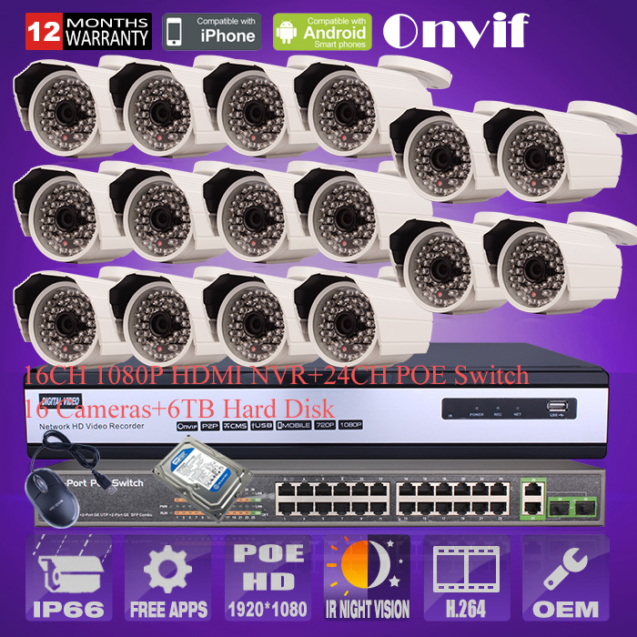 - 16CH NVR 24CH PoE Switch 16PCS 1080P 2.0Megapixel Outdoor Waterpfoof Network POE Camera system 2PCS 3TB HDD 48 IR Night Vision