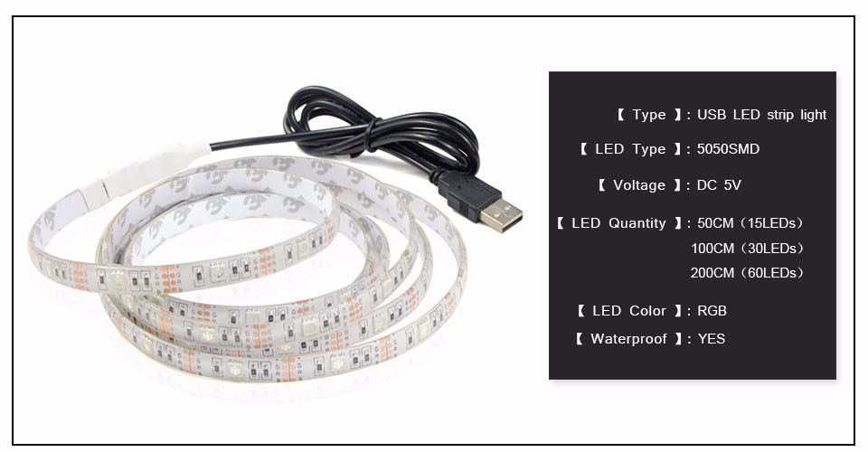 IP65 waterproof 1M 2M 3M 4M 5M DC 5V USB charger RGB LED strip light USB cable LED tape white / Black PCB TV Background lamp