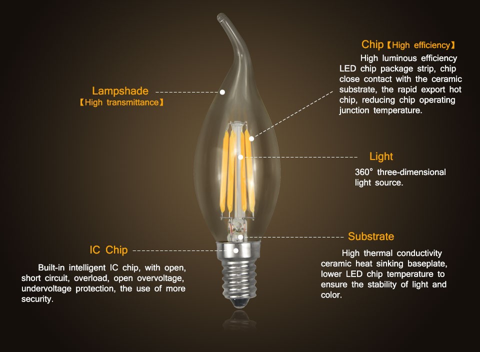 1Pcs Soft light Enough Watt AC110V / 220V 2W 4W LED Filament Retro Edison Candle lamp E14 COB Eyesight Protection LED Glass Bulb
