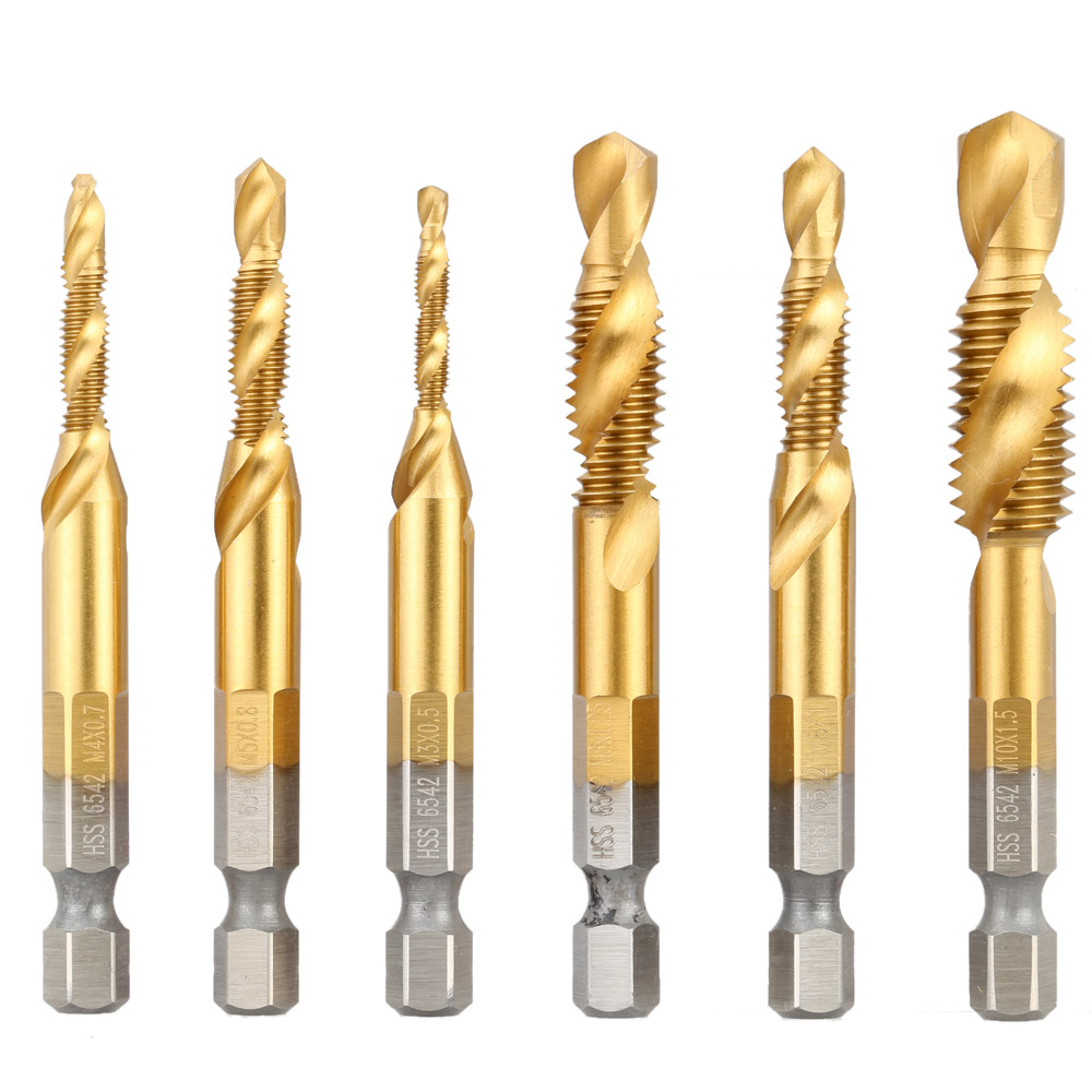 - 6 Pcs/set HSS 6542 Titanium Coated Woodworking Combined Tap and Drill Metric Deburr Countersink Bits Strong Hex Shank Spiral Tap
