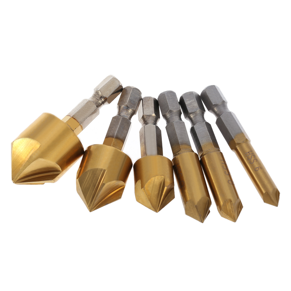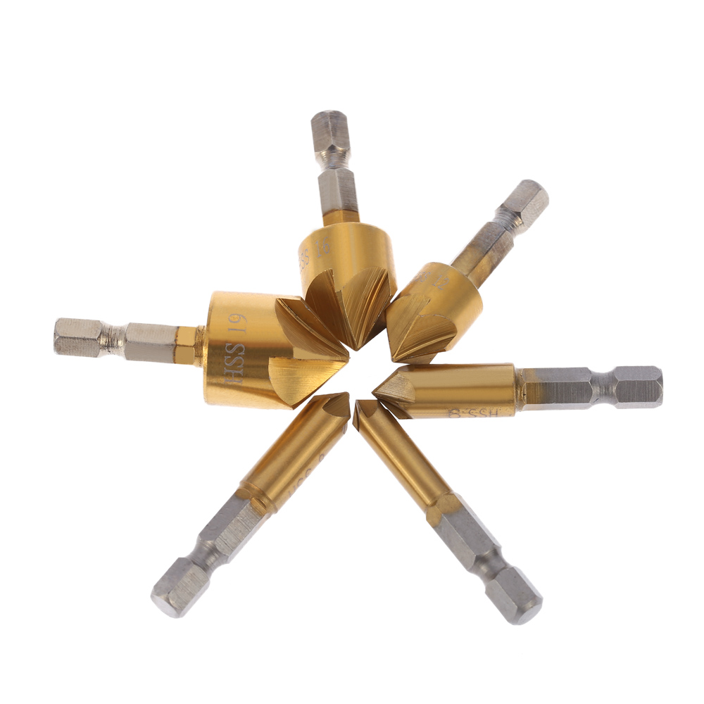 - 6pcs/set Chamferring Tool 1/4 Inch Hexagonal Shank Five Edge Chamfer Countersink Set 90 Degrees Five Blade High Quality Steel