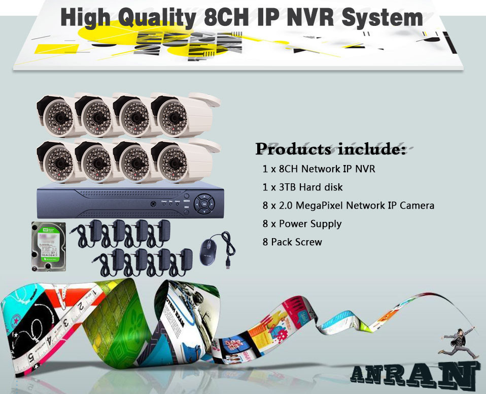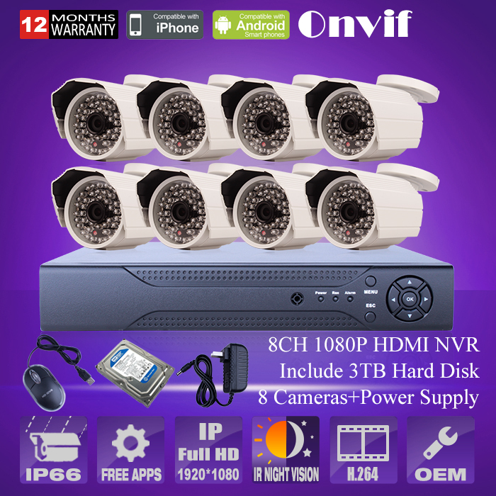 - 8CH NVR security system 8pcs 1920*1080 2.0MP Onvif 2.0 1080P IR Night vision Network IP Camera Kit 3TB HDD Home Security System