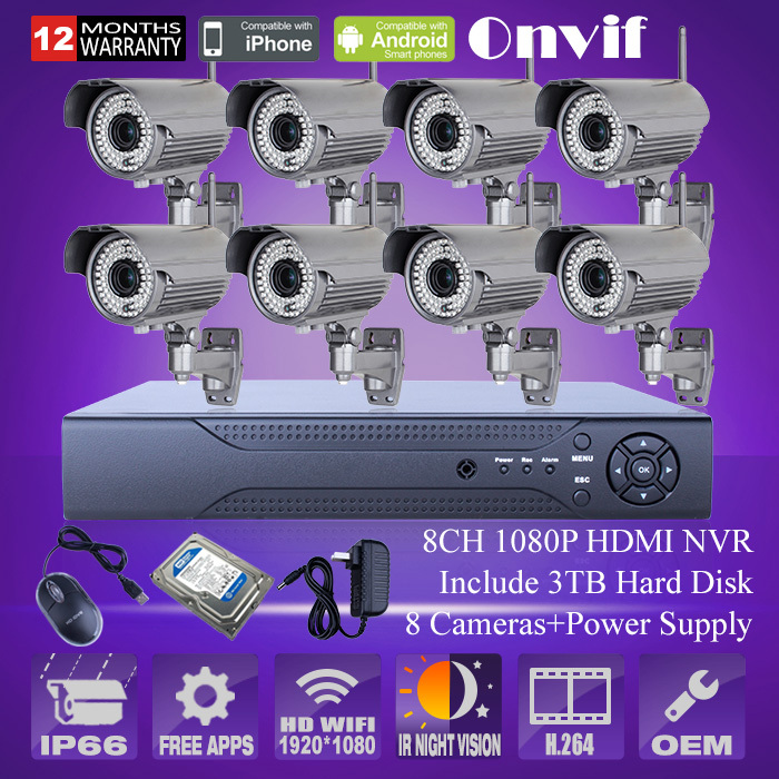 8CH NVR 1920*1080 Megapixel 1080P Wifi IP Camera Onvif H.264 Video 3TB HDD Support P2P View Security Surveillance CCTV System
