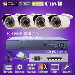 2TB HDD 8CH NVR 4CH POE Switch 1080P HD POE 2.0MP IP Camera Outdoor 36 IR Night Vision Network Security surveillance System kit