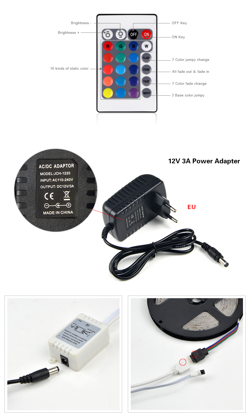 DC 12V 5M 10M 5050 SMD RGB LED Strip light IP20 / IP65 waterproof LED lamp Tape + 3A power supply Adapter + IR Remote controller