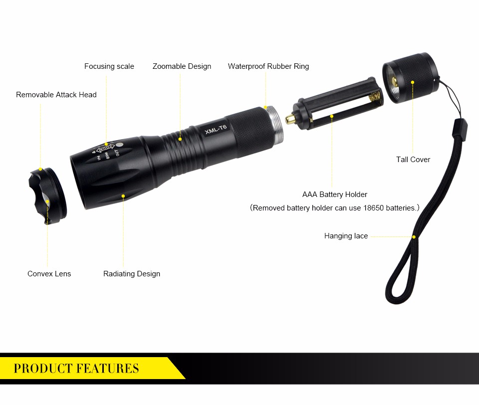 CREE XM-L T6 Aluminum Waterproof 5-Mode LED Flashlight Zoomable Focus Torches light for 18650 Rechargeable or AAA Battery