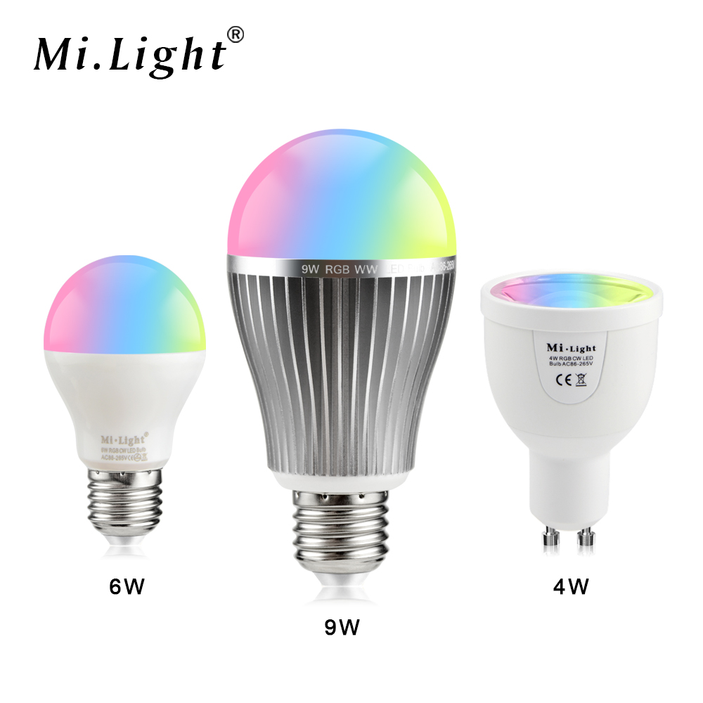 Mi light 2.4G RF wifi control Dimmable 85-265V GU10 E27 4W 6W 9W Smart Milight RGBWW RGBW Led Lamp Bulbs For Home Stage Lighting