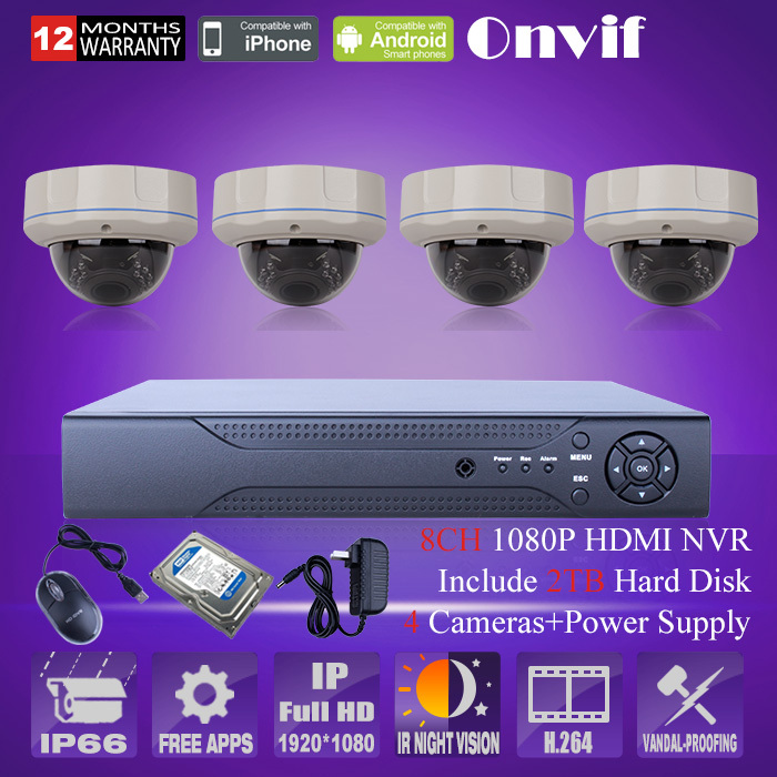 - P2P Network 8 Channel NVR System 1920x1080 2MP Dome Indoor 30IR Infrared Night Vision ONVIF CCTV Camera System with 2TB HDD