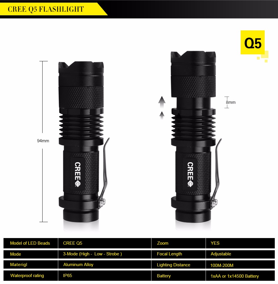- Waterproof CREE Q5 / XML T6 Aluminum LED Flashlight lanterna Zoomable Portable Torch lights For Camping Outdoor Night lighting